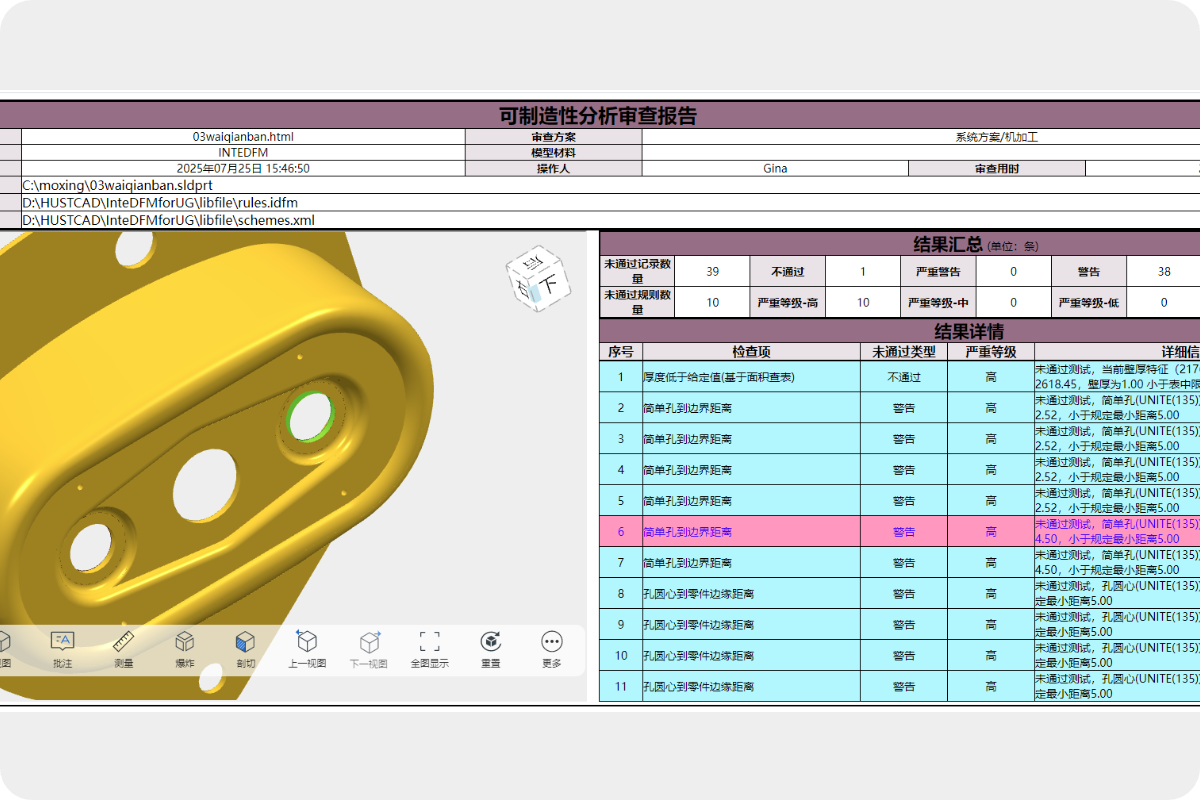 既支持輸出xml、excel、word、3D pdf等格式的審查報告,也支持輸出3D HTML格式的審查報告,提供三維模型瀏覽窗口,輔助工程師在網頁上快速定位審查結果關聯(lián)的問題區(qū)域。