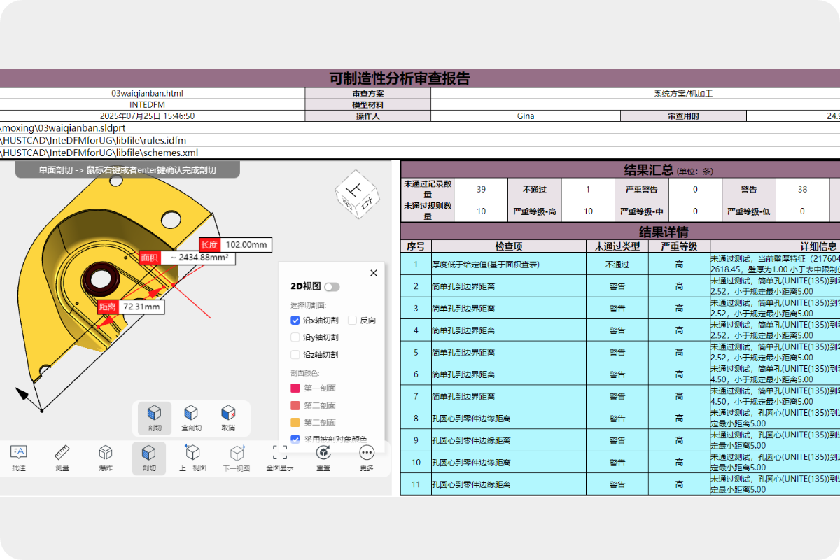 工程師可以在3D HTML格式的審查報告中使用”測量”、“剖切”等工具對模型中還存在疑問的區(qū)域進行人工檢測,修改或者增加審查結果。